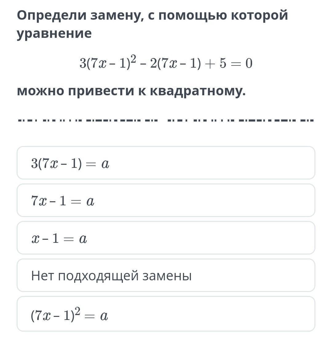 определи замену, с помощью которой уравнение 3(7х-1)2-2(7х-1)+5=0 можно привести к квадратному