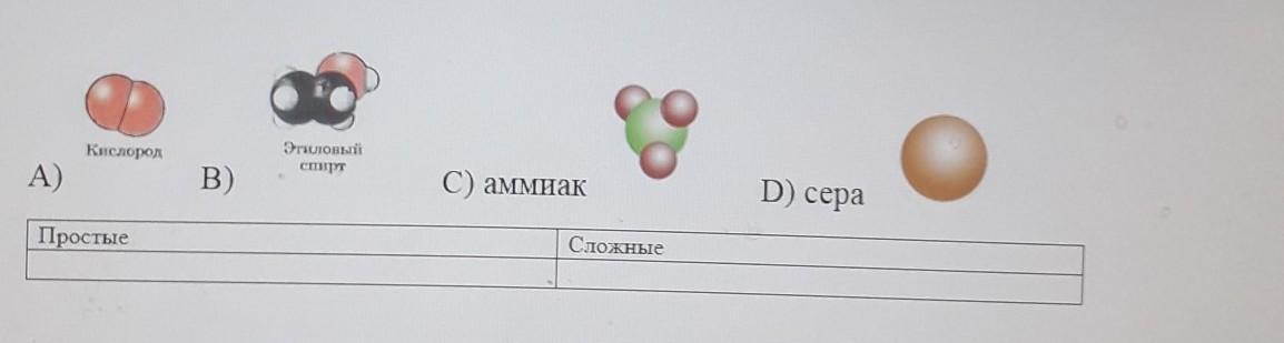 1. Изображены молекулы простых и сложных веществ, распредели на простые и сложные, заполнив