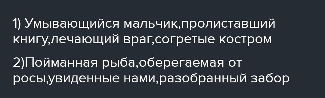 Умывающийся мальчик, пойманная рыба, разобранный забор, пролиставший книгу, оберегаемая от росы, лечащий врач, согретые костром, увиденные нами.