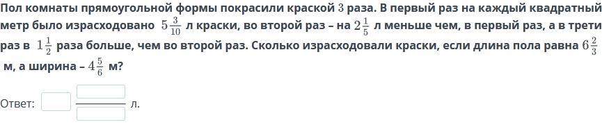 5 3/10 * 32 2/9 = 53/10 * 290/9 = 15370/90 = 170 7/9 л краски потратили на комнату в первый раз