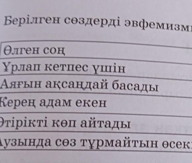 Қазақ тілі кітабында 87-,бетте 2-тапсырманы дәптерге орындаңыз.Берілген сөздерді эфемизмге айналдырып жазыңыз!