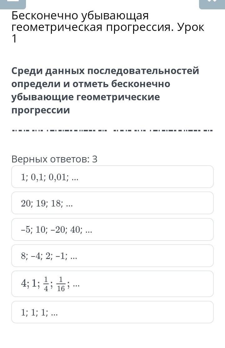 среди данных последовательностей определи и отметь бесконечно убывающие геометрические прогрессии