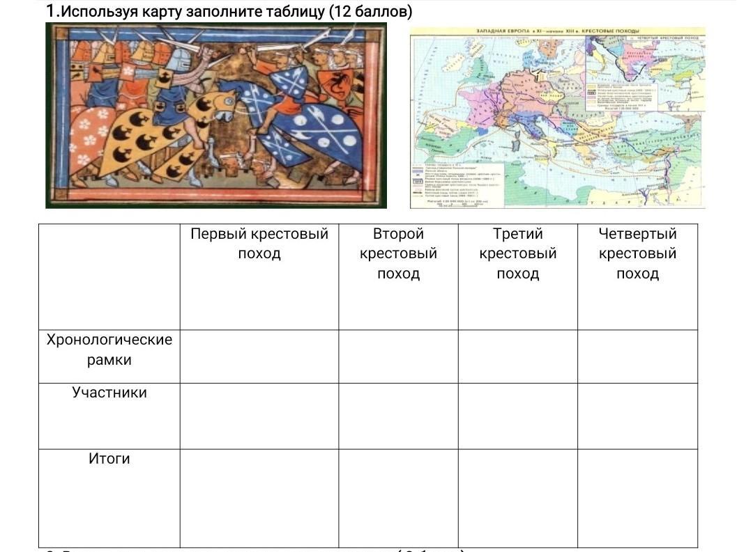 Итоги: 1 кр.п.- захват крестоносцами у сельджуков Иерусалима и образованием Иерусалимского королевства. 2 кр.п.- повод: взятие в 1144 сельджуками Эдессы. 3 кр.п.- вызван завоеванием в 1187 Иерусалима Салах-ад-дином. Безрезультатно.4 кр.п.- организован по инициативе римского папы Иннокентия 3, был направлен против Византии. На части территории которой после захвата была создана Латинская империя.