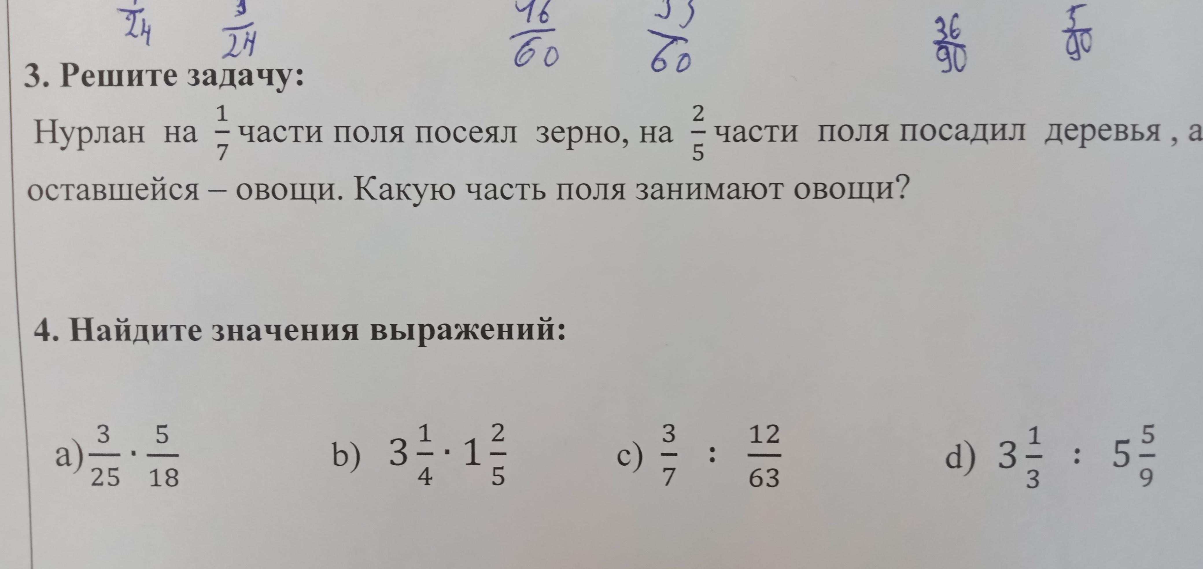 2) 6/7-2/5=(30-14)/35=16/35 - овощи