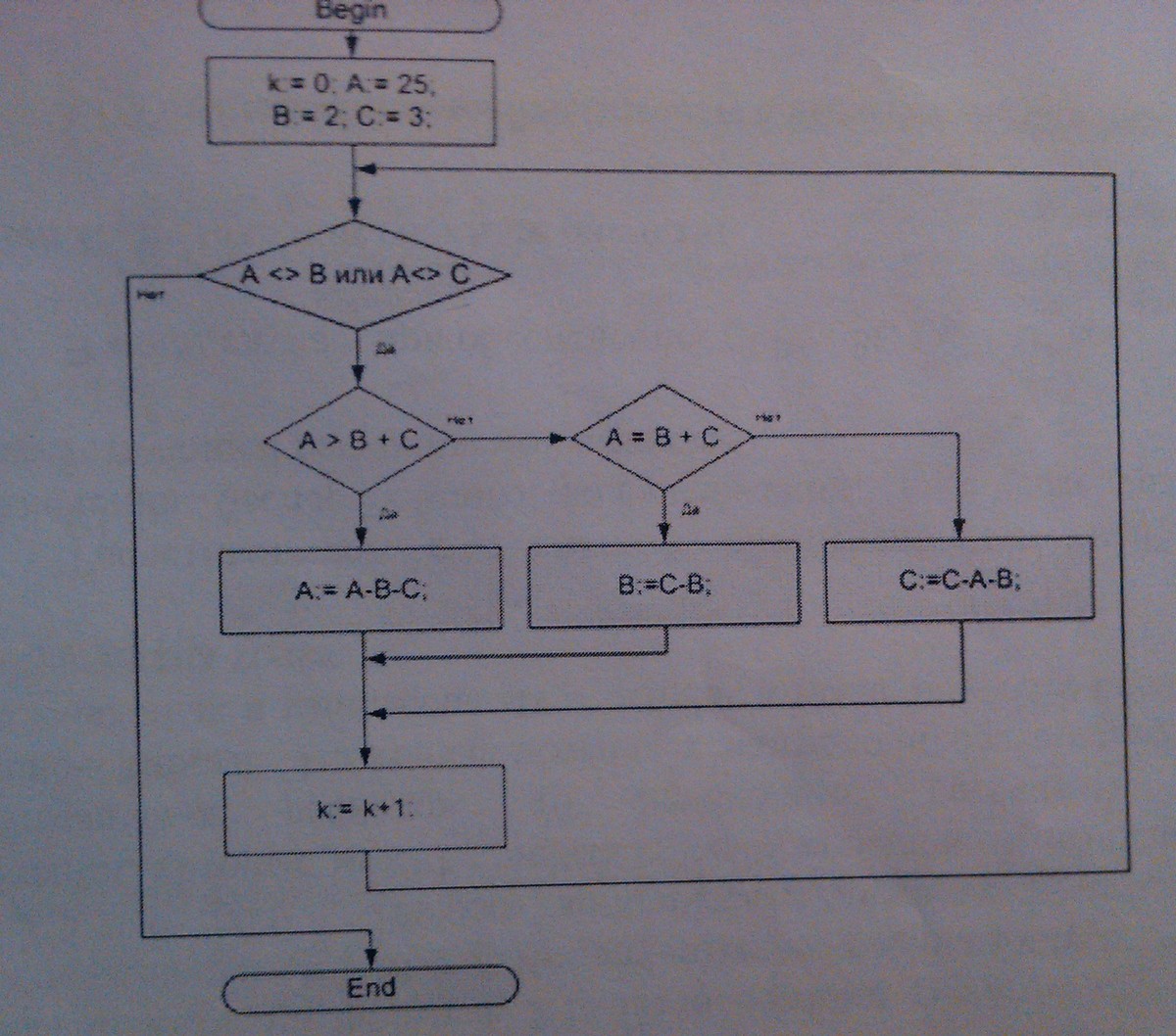 Дана блок-схема алгоритма. Определите значение целочисленной переменной k после его
