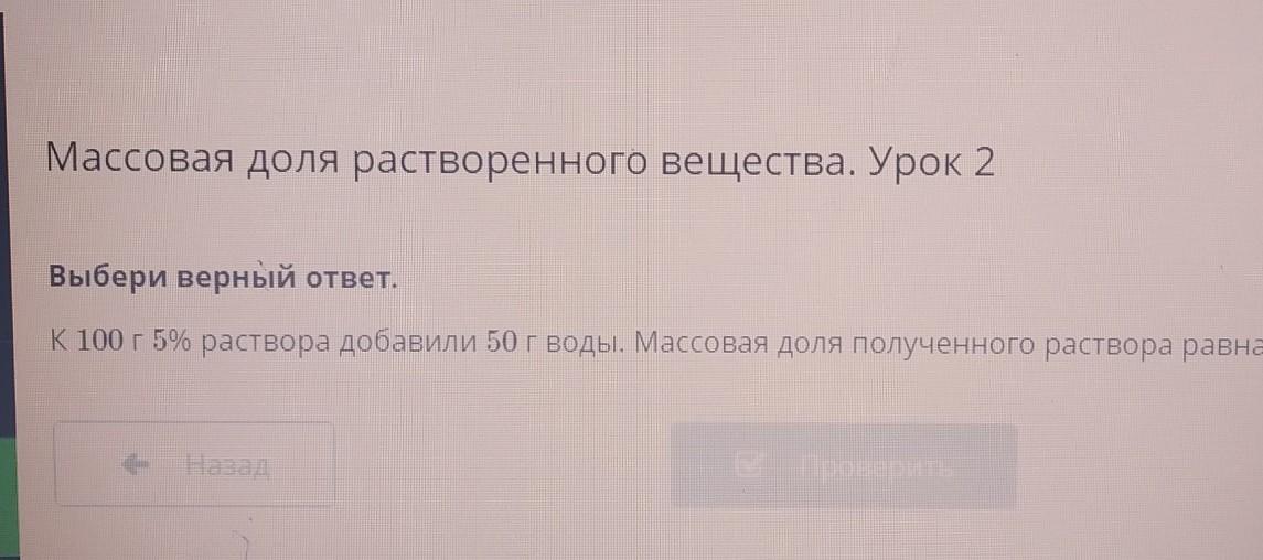 К 100 г 5% раствора добавили 50 г воды. Массовая доля полученного раствора равна