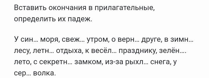 У синего моря (Р.п), свежим утром (Т.п), о верном друге (П.п), в зимнем лесу (П.п), летнего отдыха (Р.п) к весёлому празднику (Д.п), зелёное лето (И.п/Д.п - зависит от смысла предложения), с секретным замком (Т.п), из-за рыхлого снега (Р.п), у серого волка (Р.п)