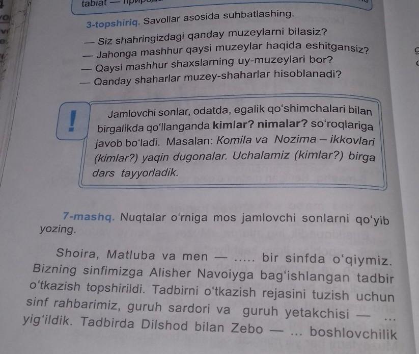 Shoira , Matluba va men- uchchalamiz bir sinfda o'qiymiz. Bizning sinfimizga Alisher Navoiyga bag'ishlangan tadbir o'tkazish topshirildi. Tadbirni o'tkazish rejasini tuzish uchun sinf rahbarimiz, guruh sardori va guruh yetakchisi uchtamiz yig'ildik. Tadbirda Dilshoda va Zebo- ikkalasi boshlovchilik qilishdi.