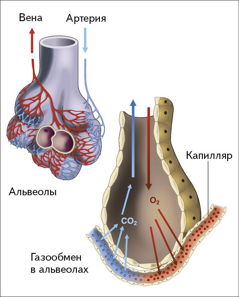Альвеолы оплетены густой сетью капилляров. Тут происходит газообмен, кровь насыщается кислородом.