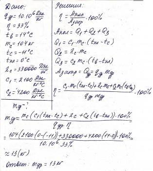 (Удельная теплота плавления снега λ=330000Джкг, удельная теплоёмкость снега с1=2100Джкг⋅°С, удельная теплоёмкость воды с2=4200Джкг⋅°С, удельная теплота сгорания дров q=10⋅106Джкг).