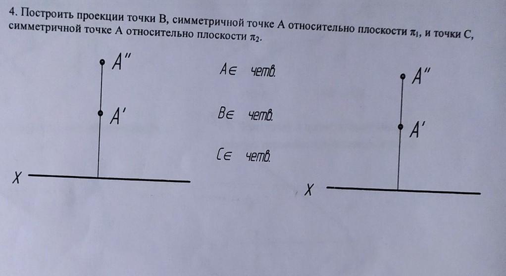 срочно нужно помогитее Построить проекции точки В, симметричной точке А относительно плоскости п1, и точки С симметричной точке А относительно плоскости п2