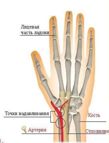 Надавить указательным и средним пальцами на внутреннюю часть запястья.