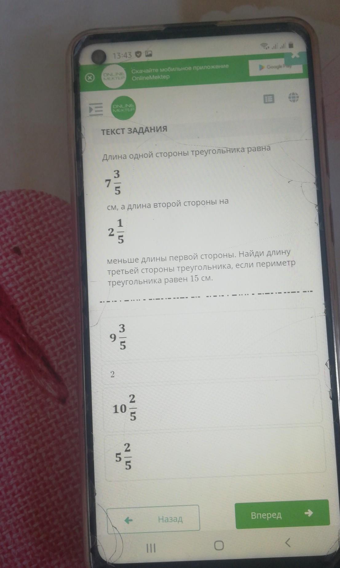 Тогда 7,6см(одна сторона)+5,4см(вторая сторона); следовательно третья сторона 15-13=2см