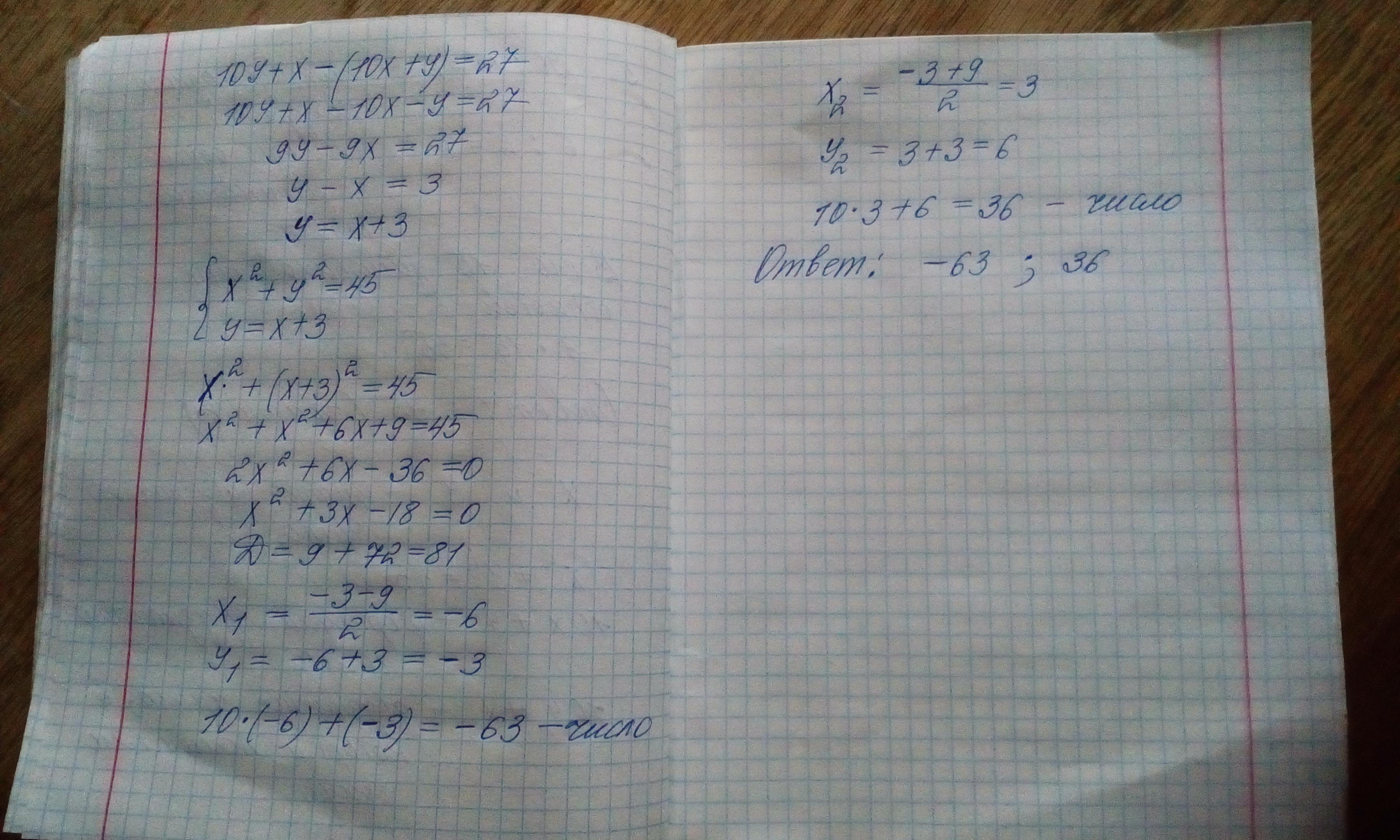Сумма квадратов цифр у двузначного числа равна 45. Если в этом числе поменять местами цифры,то получится число на 27 больше первоночального. Найдите это число. ПОЖАЛУЙСТА! СРОЧНО НАДО