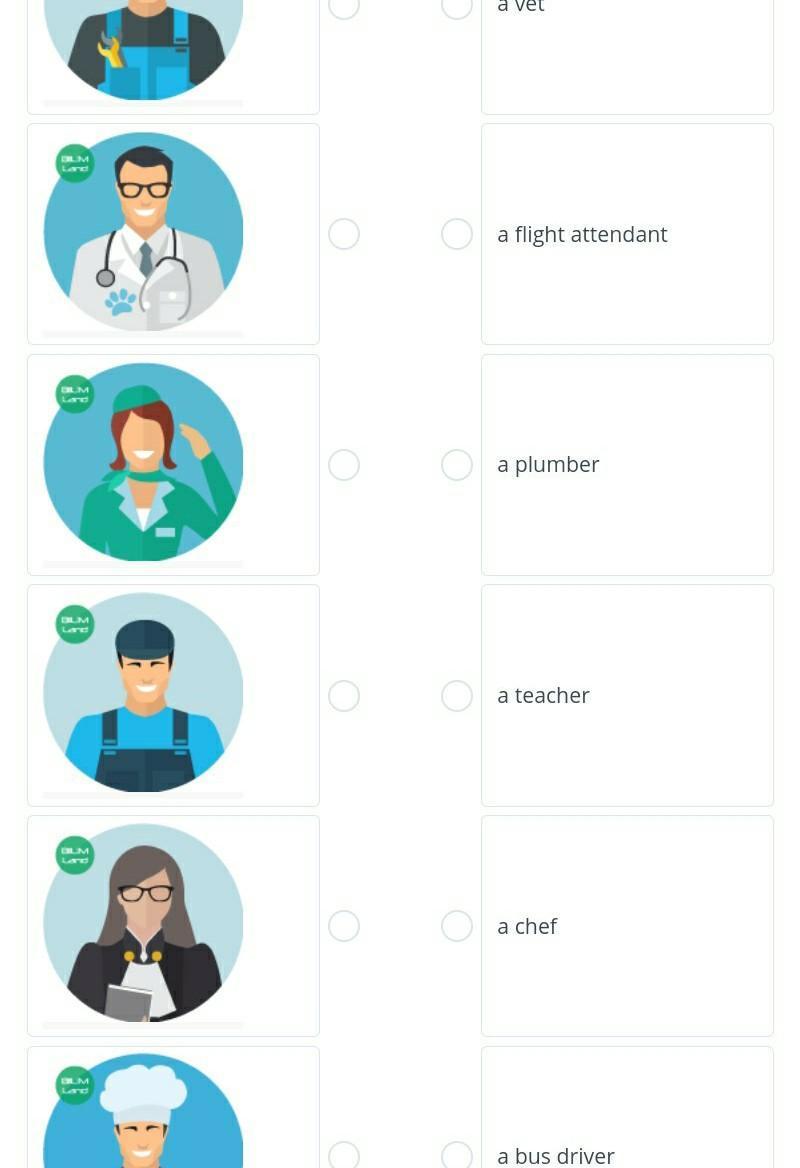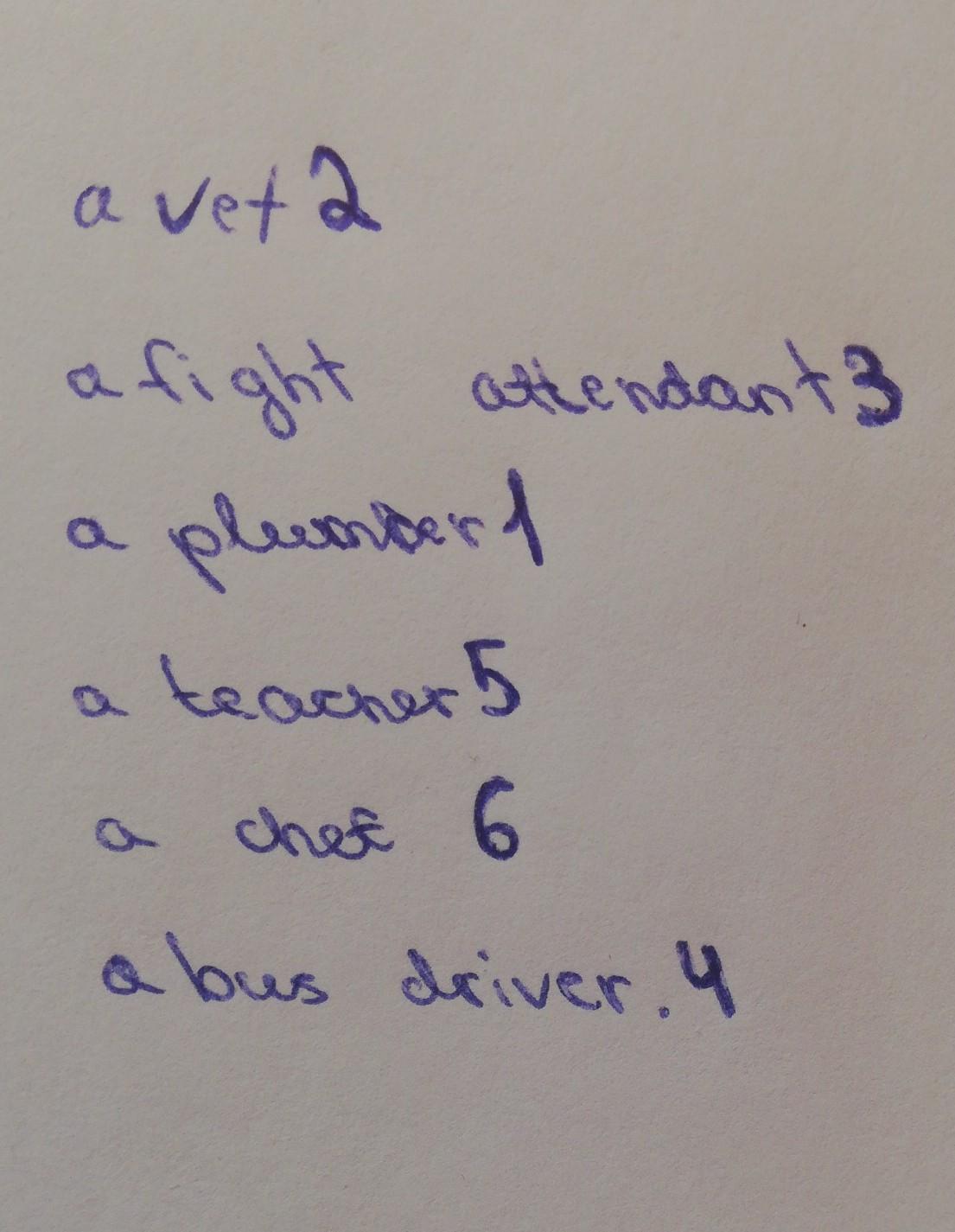 1a fight attend 2vet3plumber4bus driver5teeacher6chef