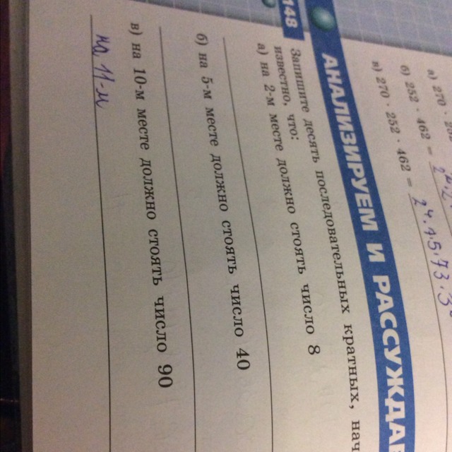 Запишите десять последовательных кратных, начиная с наименьшего, если известно что на 2 месте должно стоять число 8 на 5 40 на 10 90