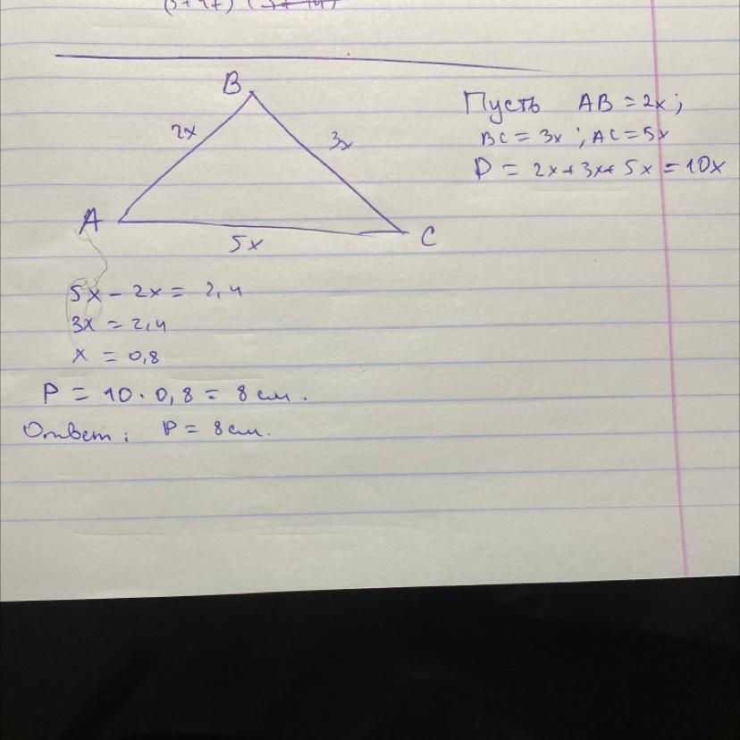 Сторони трикутника відносяться як 2:3:5. Різниця найбільшої та найменшої сторони 2,4 см. Знайти периметр трикутника.