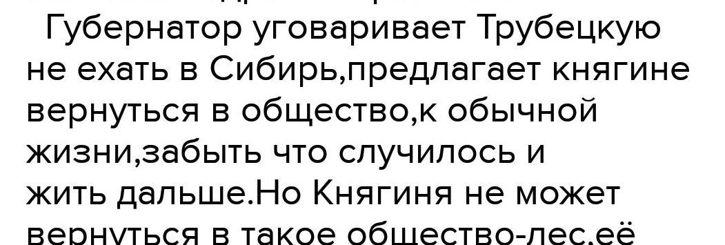 В. Последней попыткой губернатора остановить княгиню Трубецкую были его увещевания о том, что она должна будет отречься от богатства и привилегированного положения, лишиться всех прав на наследование имущества, на возвращение в центральную Россию. Княгиня отвечала, что готова пойти за мужем и пешком, что подпишет отреченья от своих прав, которыми “не дорожит”. Для неё нет дороги назад, где “и прежде был там рай земной”,