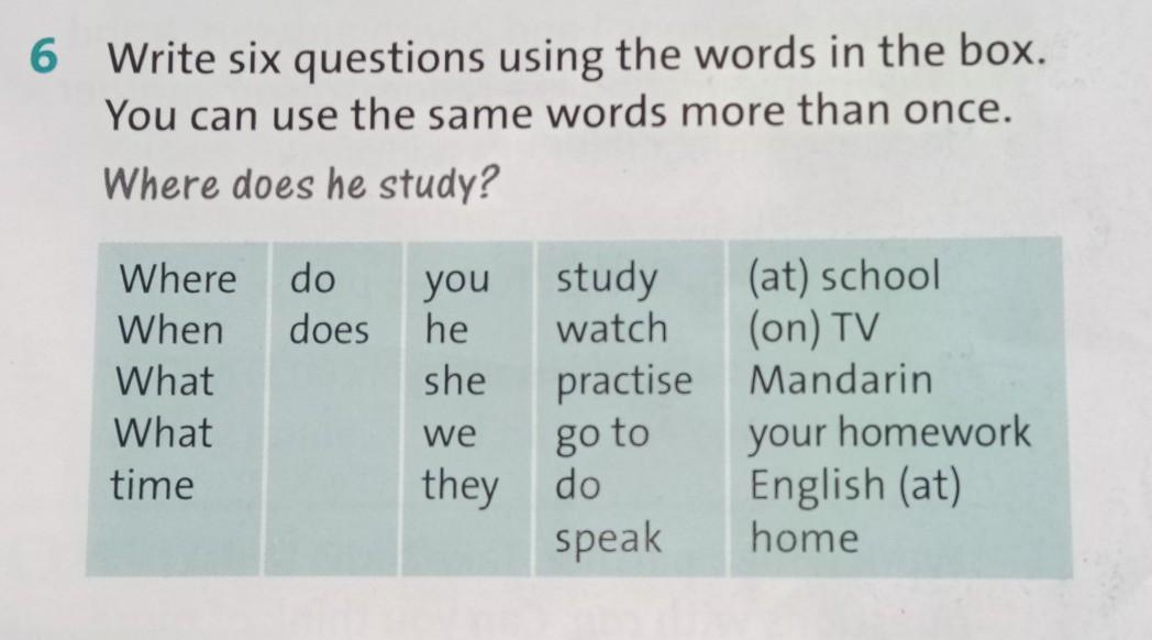 6 Write six questions using the words in the box.