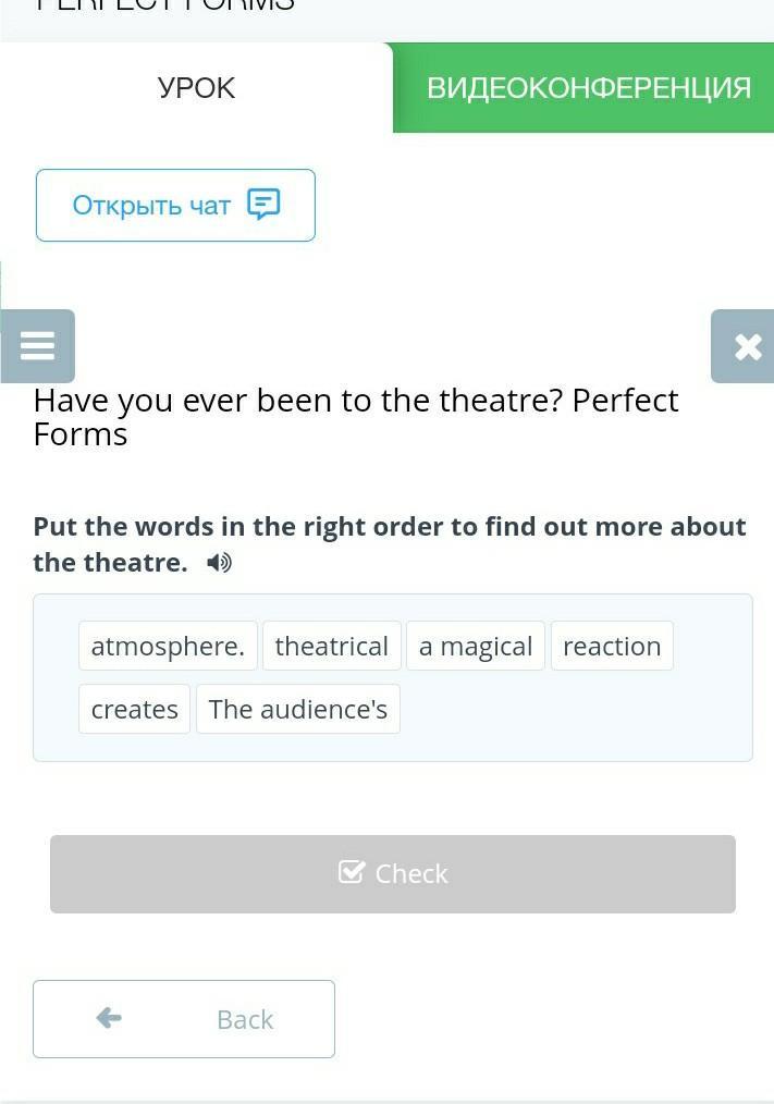 Have you ever been to the theatre? Perfect Forms Put the words in the right order to find out more about the theatre. ) atmosphere. theatrical a magical reaction creates The audience's