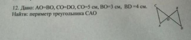 треугольники САО=ОВD т.к. угол СОА= углу BOD как вертикальные, АО=ОВ и СО=DO, следовательно треугольньки равны по двум сторонам и углу между ними-первый признак равенства треугольников, следовательно BD=CA=4, следовательно PтреугольникаСАО=СА+СО+АО=4+5+3=12