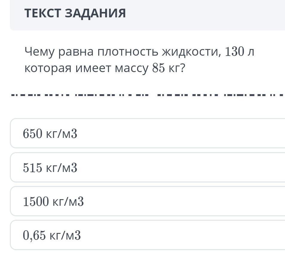 ПОМОГИТЕ ПОЖАЛУЙСТА!!!!Чему равна плотность жидкости 130 л который имеет массу 85 кг