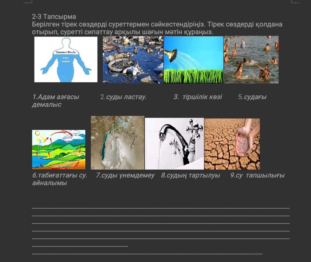 Бүкілі біледі тіршіліктің көзі күн мен су болады. Жерде 79%-зы су болады олар 24 сағат аптасына су айналымы өтеді, бірақ бұны есті суды ластай беруге болмайды. Су ды бәрлық тірі ағза тапшылданады, Мысалы адам ағзасын айтайық;Адам ағзасында көптеген токсиндік заттар кездеседі. Өндірістің зияны, пайдасыз тағам, көліктен шығатын шаң-тозаң, осының бәрі біздің ағзамыз кезігетін жағымсыз заттардың бір бөлігі. Одан бөлек, тамақты қайта ысыту кезінде көптеген токсиндік заттар пайда болады. Ал бұл кейін тамақтан улануға әкеліп соқтырады. Қуанышқа қарай, судың көптігінен біздің бүйректеріміз жақсы жұмыс істеп, несеп арқылы ағзадағы қажетсіз заттарды шығарады