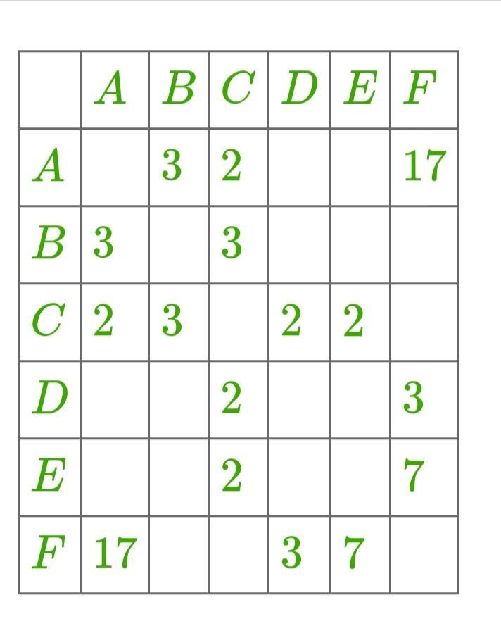 Между населёнными пунктами A, B, C, D, E, F построены дороги. Определи длину кратчайшего пути между пунктами A и F. Передвигаться можно только по дорогам, протяжённость которых указана в таблице
