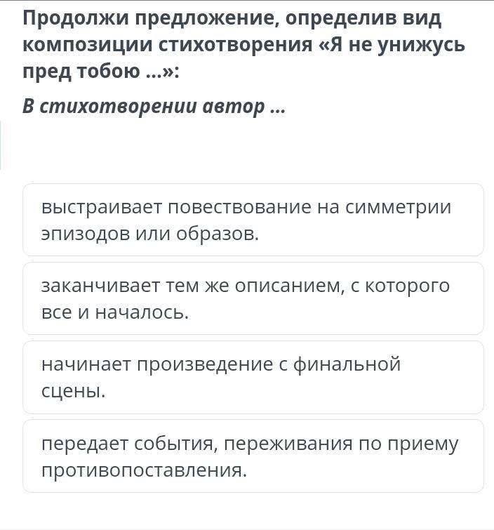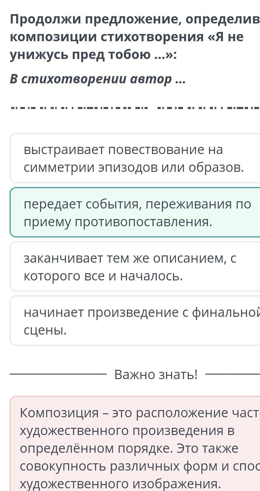 Предложи предложение :определив вид композиции стихотворения" Я не унижусь пред тобой..."