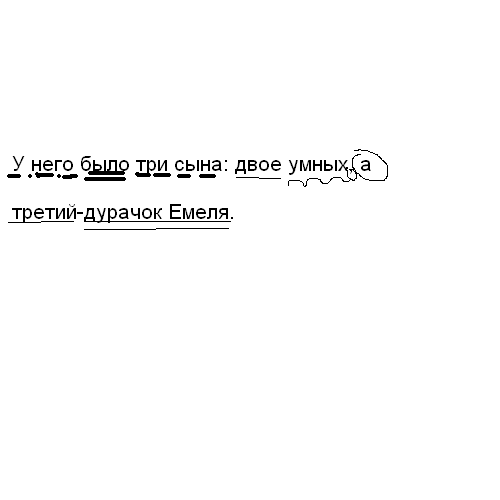 Помогите разобрать предложение по составу . У него было три сына: двое умных,а третий-дурачок Емеля.