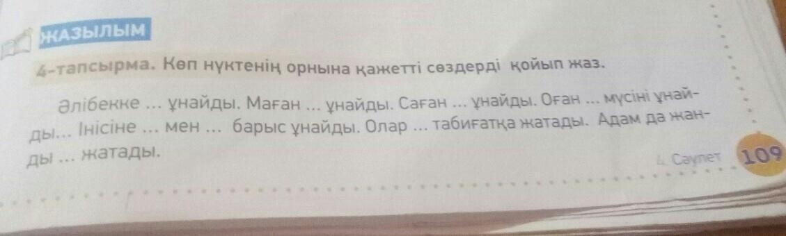 4-тапсырма. Көп нүктенің орнына қажетті сөздерді қойып жаз.