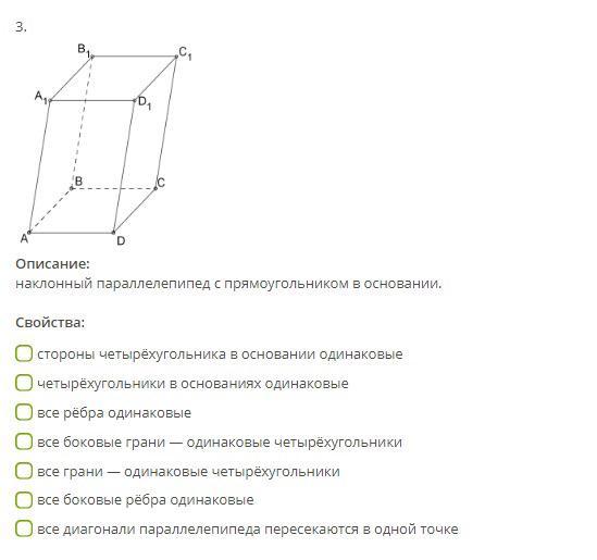 Отметь, какие свойства имеет параллелепипед, рисунок и описание которого перед тобой.