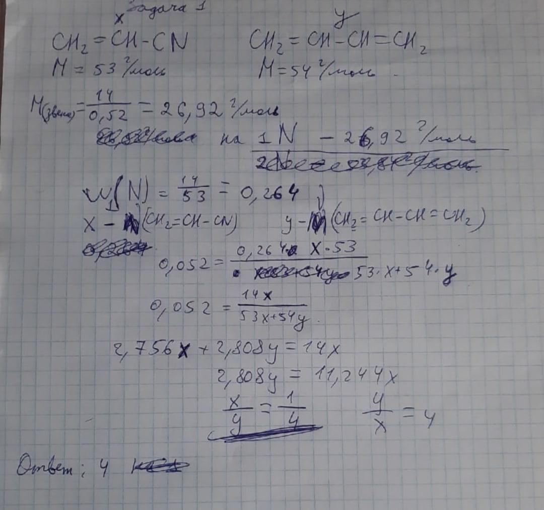 Массовая доля азота в синтетическом каучуке марки СКН (сополимер акрилонитрила CH2=CH–CN и бутадиена-1,3) равна 5,2 %. Cколько звеньев бутадиена приходится на одно звено акрилонитрила в макромолекулах этого сополимера?