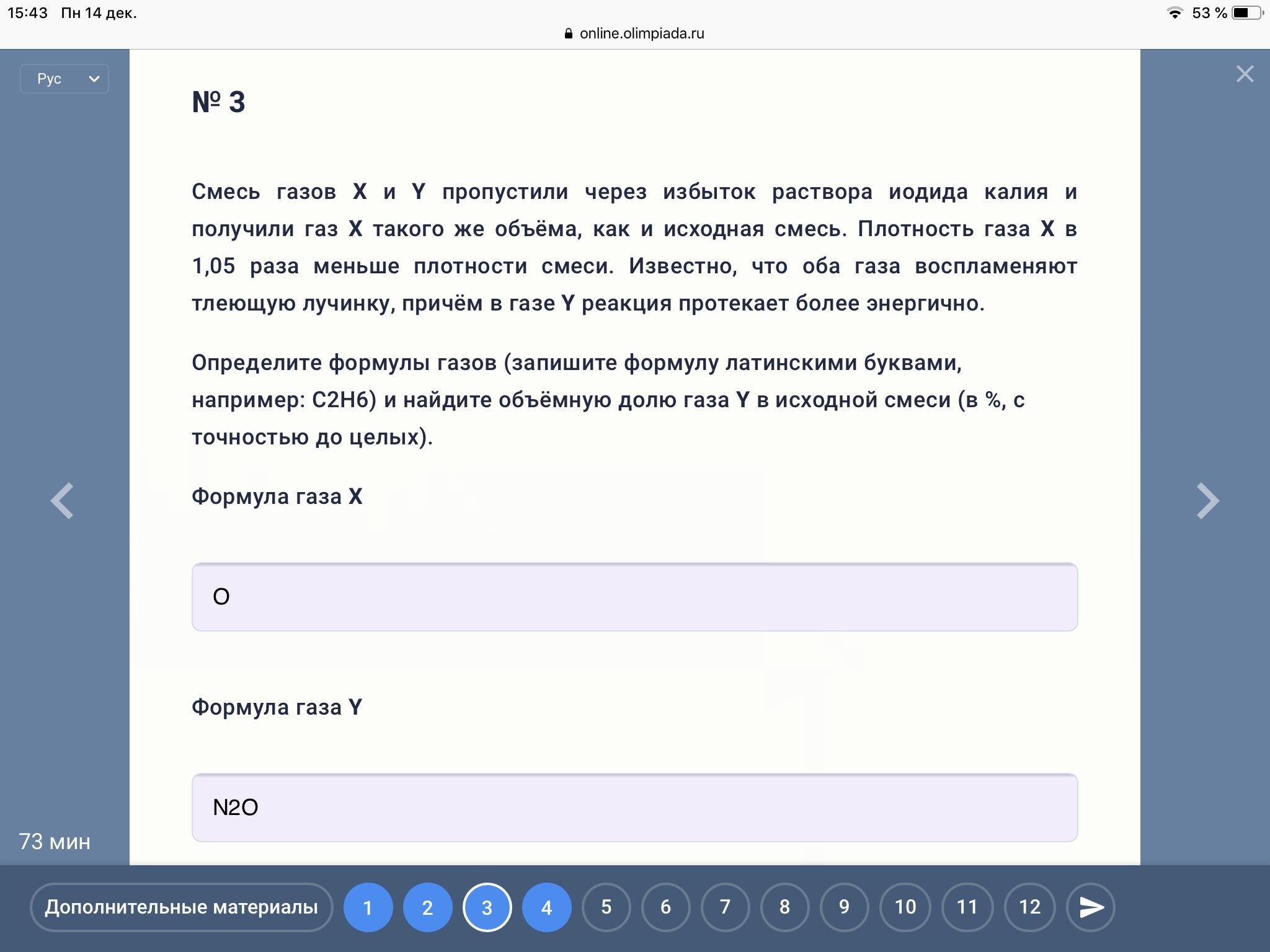 3. Смесь газов X и Y пропустили через избыток раствора иодида калия и получили газ X такого же объёма, как и исходная смесь. Плотность газа X в 1,05 раза меньше плотности смеси. Известно, что оба газа воспламеняют тлеющую лучинку, причём в газе Y реакция протекает более энергично.