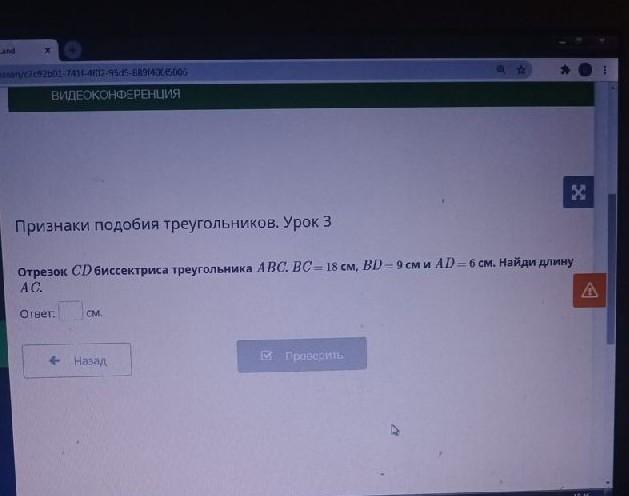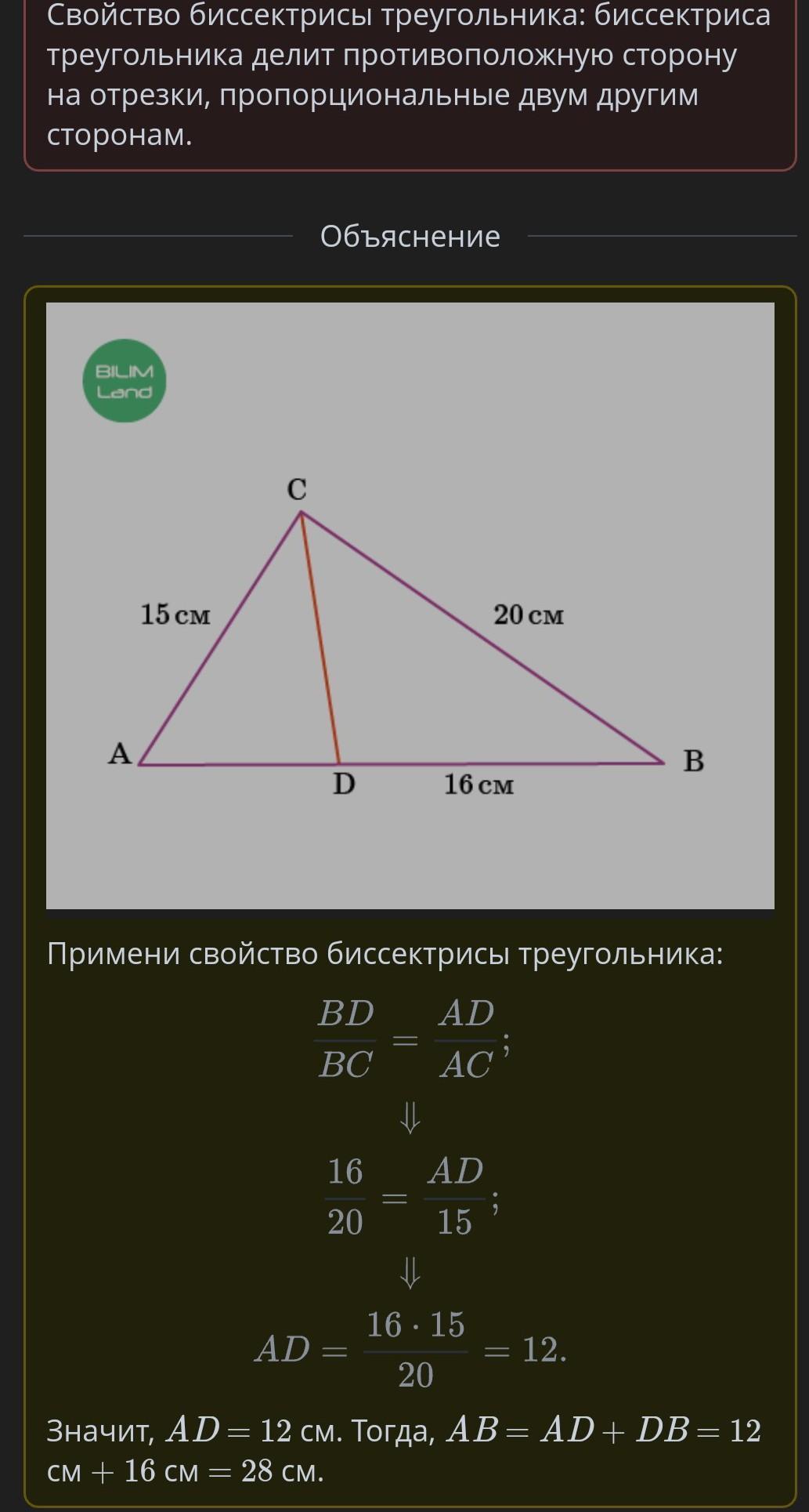 Отрезок CD биссектриса треугольника АВС. АС — 15 см, ВС = 20 см и BD = 16 см. Найди
