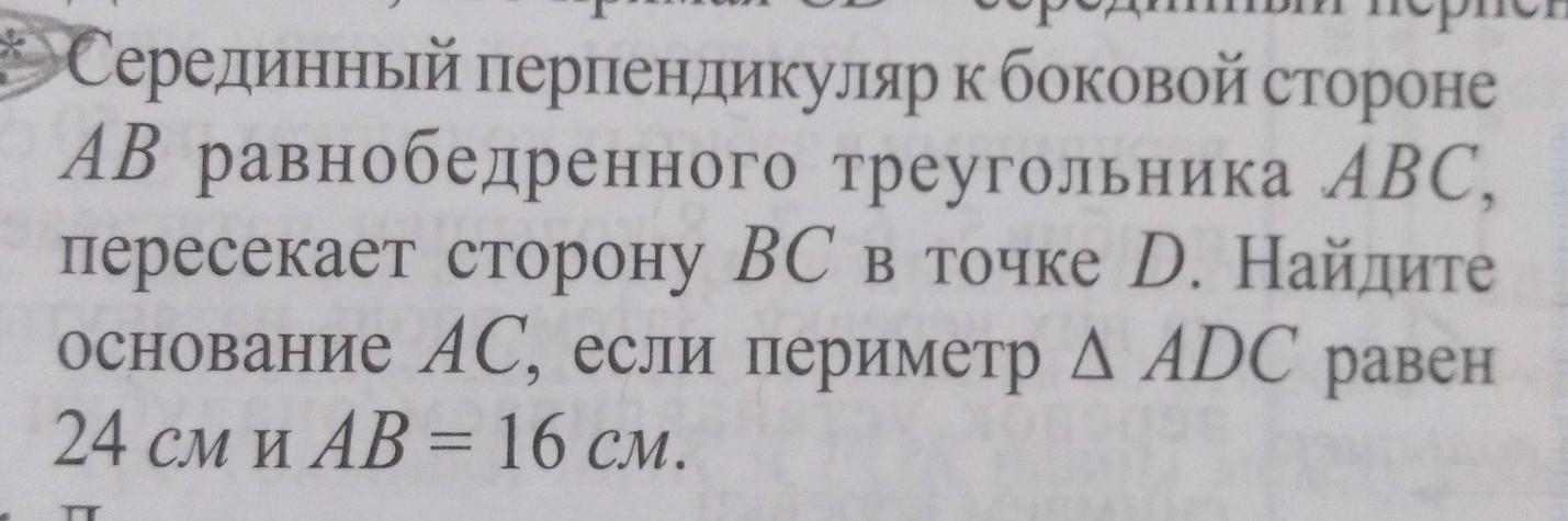 Серединный перпендикуляр к боковой стороне AB равнобедренного треугольника ABC, пересикает сторону BC в точку D.Найдите основание AC, если периметр, ∆...Помогите пожалуйста