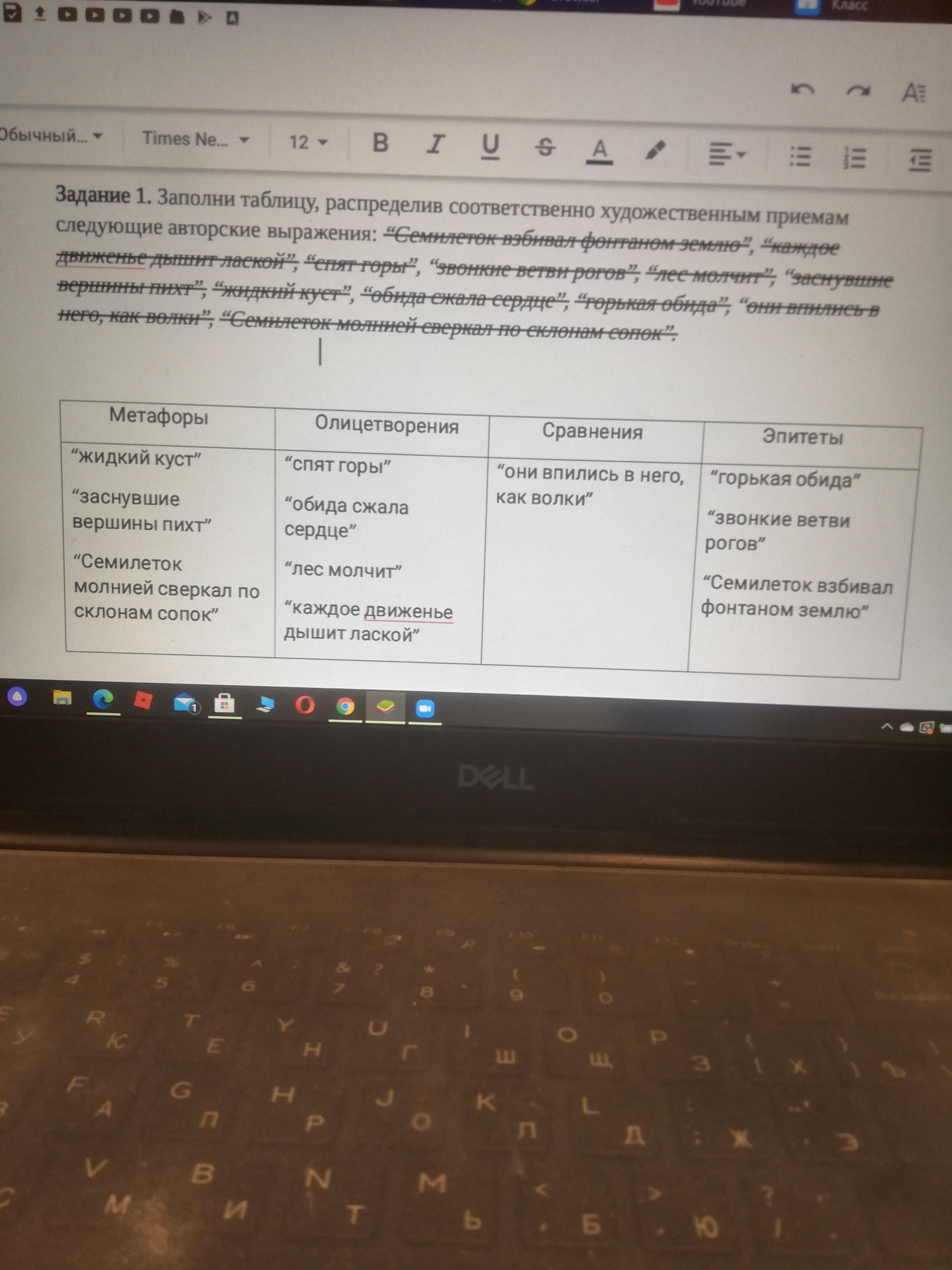 Заполните таблицу распределив соответственно художественным приёмам следующий авторские выражение. "семилеток взбивала фонтан землю" "каждое движение дышит лаской" "спят горы" "звонкие ветви врагов" "лес молчит" "заснувшие вершины пихт" "жидкий куст" "обида сжала сердце" "горькая обида" "они впились в него как волки" "семилеток молнией сверкал по склонам сомлк" метафоры, олицетворения, сравнения, эпитеты. Определите