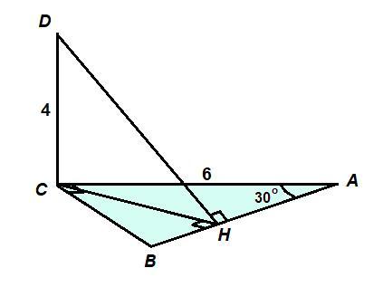 Один з катетів прямокутного трикутника АВС дорівнює 6, а гострий кут, прилеглий до цього катета, дорівнює 30 градусів. Через вершину прямого кута С проведено відрізок СD, перпендикулярний до площини цього трикутника, СD = 4. Визначити відстань від точки D до прямої АВ.