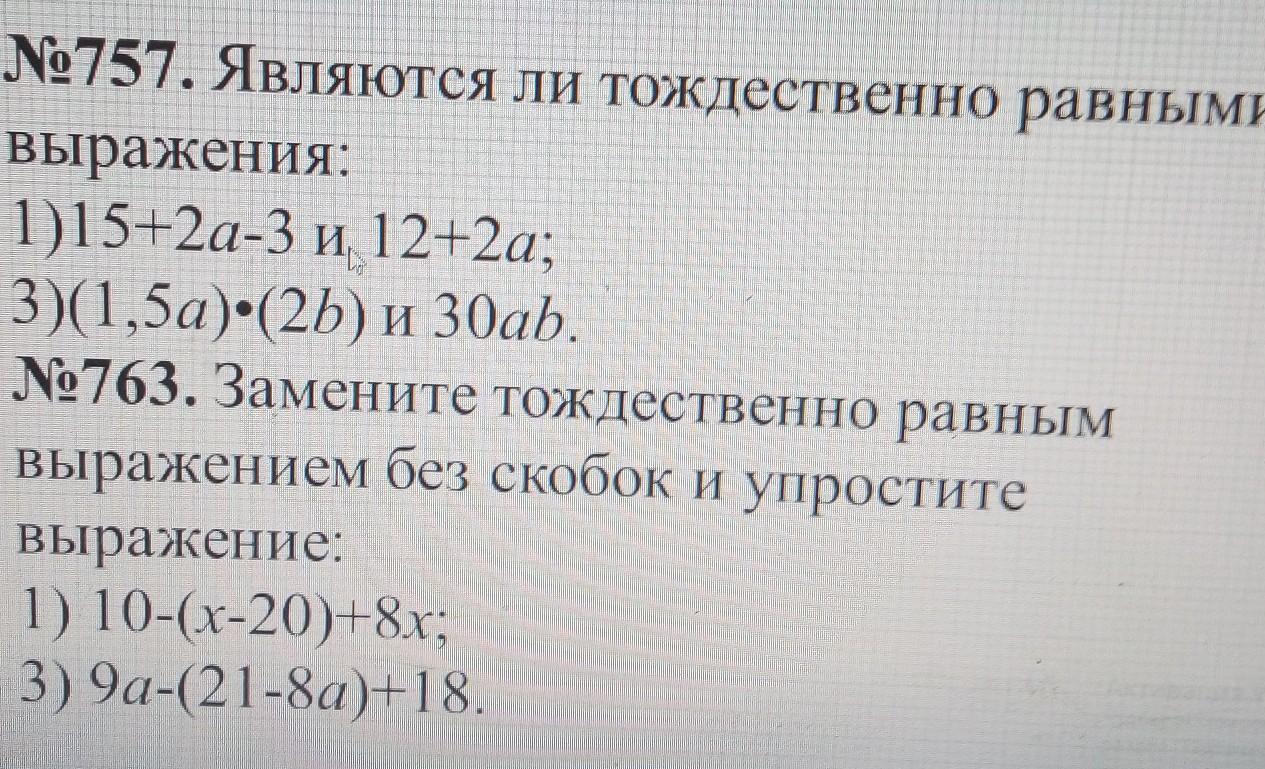 N757 1)да,потому что 15+2а-3=12+2а 3)нет, потому что (1,5а)*(2в)=3ав N763 1)10-(х-20)+8х=10-х+20+8х=30+7х 3)9а-(21-8а)+18=9а-21+8а+18=17а-3