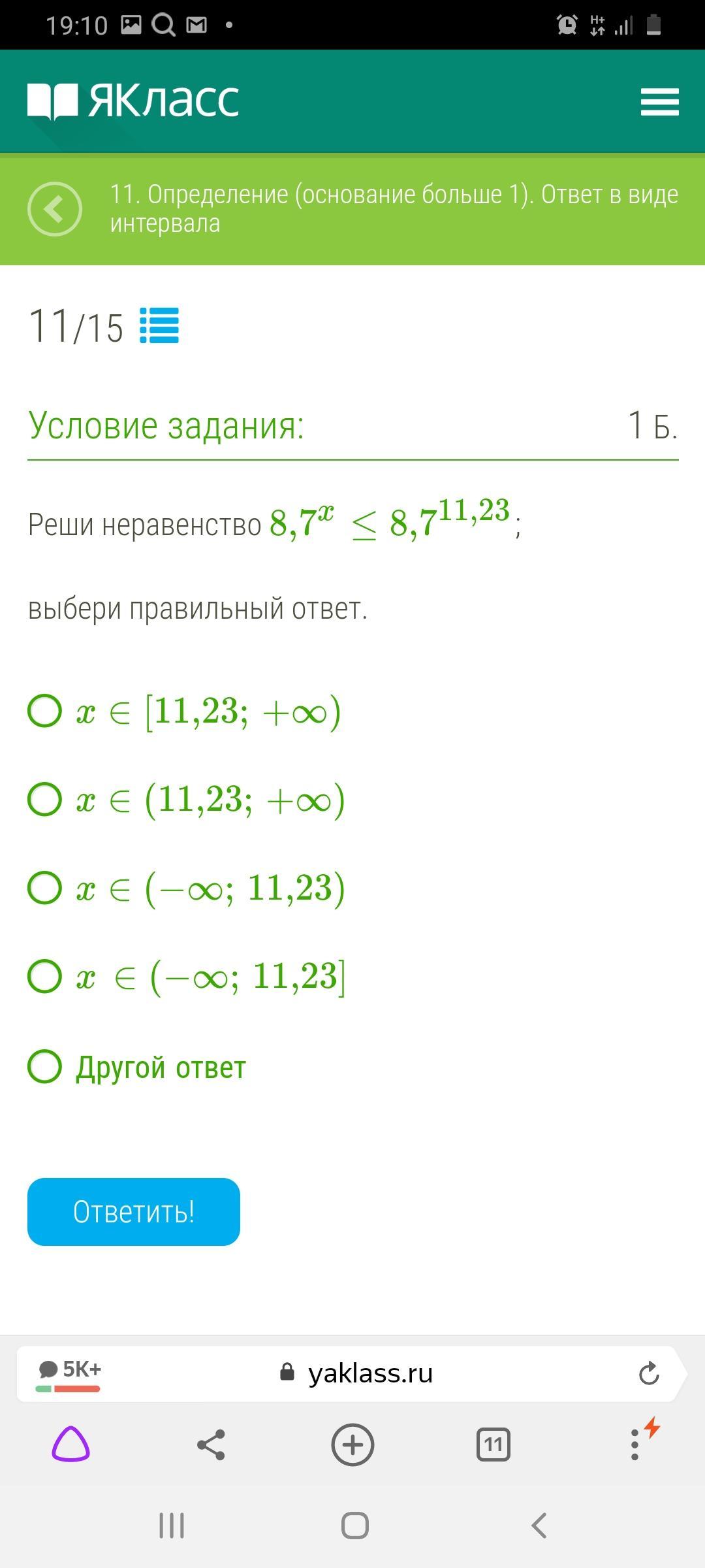 Правильный ответ первый: икс принадлежит от 11,23 включительно до плюса бесконечности.