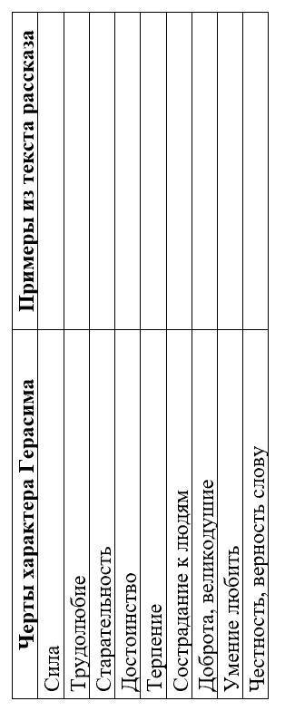 терпение-глухонемой герасим подчинялся приказаниям барыни, так как был крепостным, подневольным человеком сострадание к людям-...начальница татьяны, принялась Её,как говорится, шпынять и до того её довела, что та,бедная,не знала, куда глаза деть, чуть не плакала с досады. герасим вдруг приподнялся, протянул свою огромную ручищу, наложил её на голову кастелянши и с такой угрюмой свирепостью посмотрел ей в лицо, что та так и пригнулась к столу. все умолкли. умение любить-герасим поглядел на несчастную собачонку, подхватил её одной рукой, сунул её к себе за пазуху и пустился большими шагами домой. он вошёл в свою каморку, уложил спасённого щенка на кровати, прикрыл его своим тяжелым армяком, сбегал сперва в конюшню за соломой, потом в кухню за чашечкой молока.