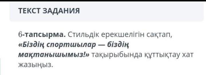 ТЕКСТ ЗАДАНИЯ6-тапсырма. Стильдік ерекшелігін сақтап, «Біздің спортшылар — біздің мақтанышымыз!» тақырыбында құттықтау хат жазыңыз. срочно Пжжжжжжжжжжжжжжжжжжжж