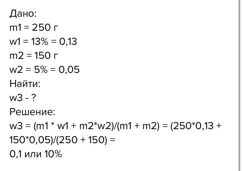 Задача: смешали 250 г 13% раствора поваренной соли и 150 г 5% раствора этой же соли. Определите массовую долю соли в полученном растворе.