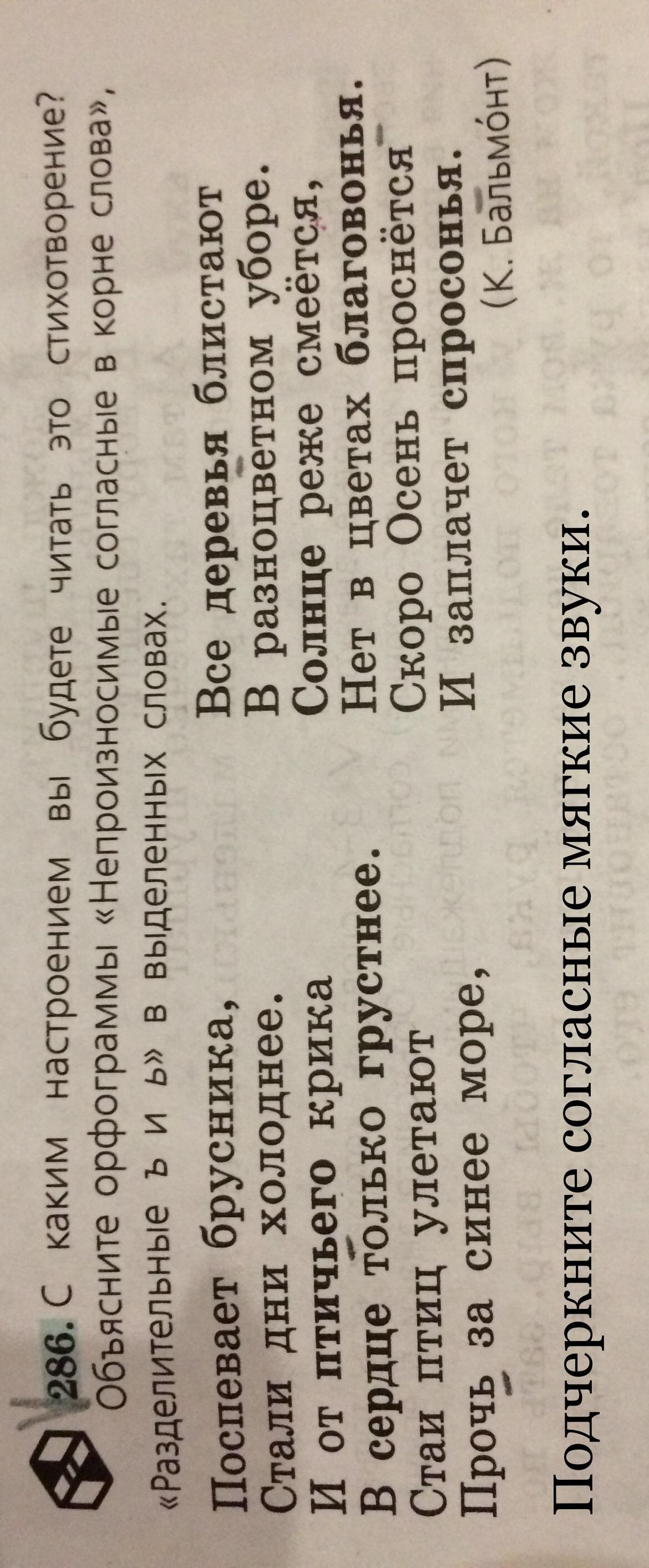 С каким настроением вы будете читать это стихотворение объясните орфограммы непроизносимые согласные в корне слово разделительный твёрдый и мягкий выделенные словах. Поспевает брусника, Стали дни холоднее. И от птичьего крика В сердце только грустнее.Стаи птиц улетают Прочь за синее море,Все деревья блистают В разноцветном уборе. Солнце реже смеётся, Нет в цветах благовонья. Скоро Осень проснётся И заплачет спросонья.Подчеркните согласные мягкие.