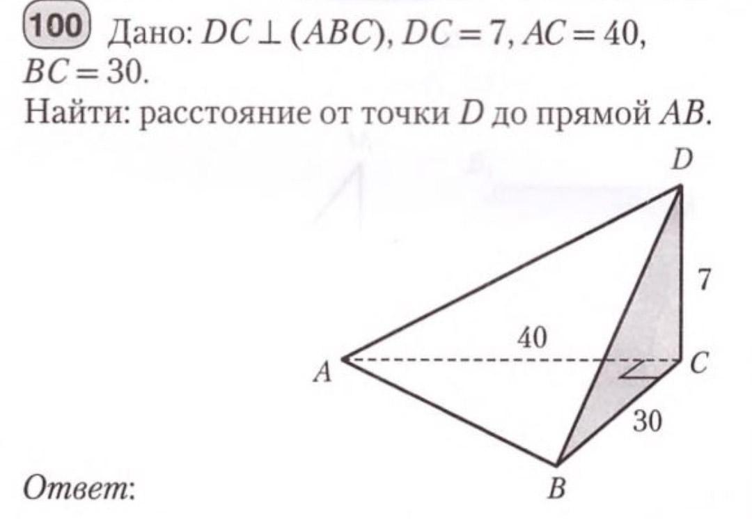 АВ=√(40²+30²)=50), высота - h=40*30/50=24, тогда расстояние от D до АВ по т. Пифагора - √(24²+7²)=25 ед.