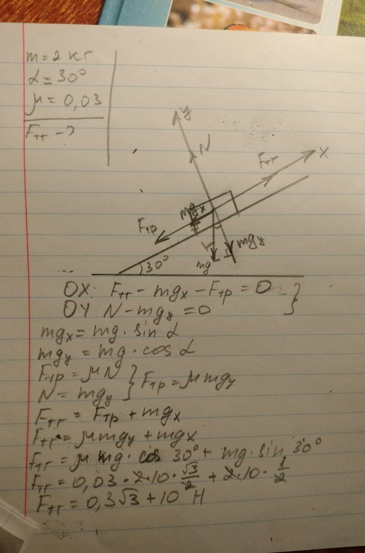 Тіло масою 2кг тягнуть рівномірно вверх по похилій площині що утворює кут 30° з горизонтом.Знайти силу з якою тягнуть тіло , якщо коефіцієнт тертя дорівнює 0.03