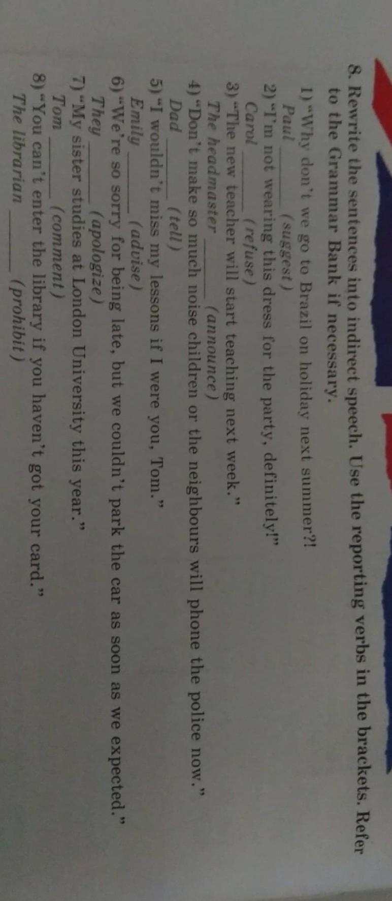 (1)suggested (2)rejected (3)announced(4)said(5)advised(6)apologized(7)comment(8)prohibited