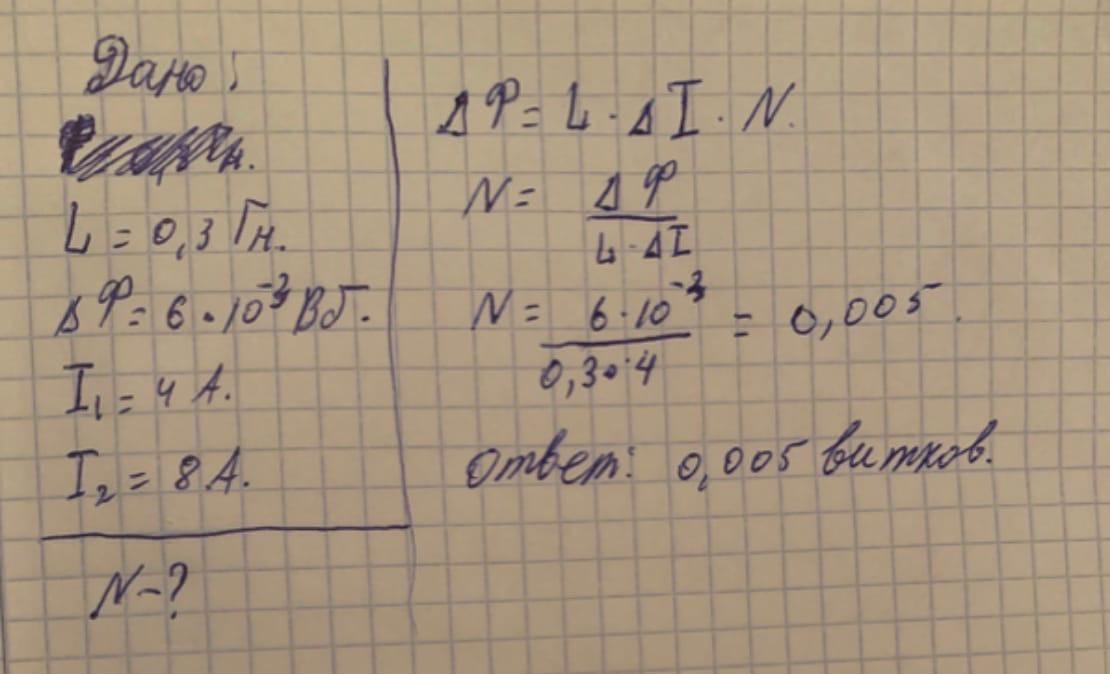 Магнитный поток через катушку индуктивностью 0,3 изменился на 6 мВб при изменении в ней силы тока с 4 до 8А. Чему равно число витков катушки?