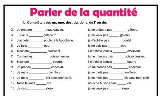 2. un 3. du 4. un 5. de l' 6. un 7. un 8. du 9. du 10. de la 11. du 12. du 13. du