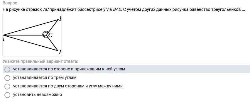 На рисунке отрезок АС принадлежит биссектрисе угла ВАD. С учётом других данных рисунка равенство треугольников ...